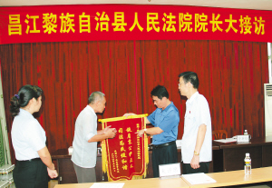 在5月6日的全省法院大接访活动中,昌江法院共接待来访5人,涉及案件5件,全部当场解决。图为一位白发老人戚某为感谢昌江法院为他解决了一宗民间借贷案,来到接访现场,给昌江法院送上一面写着“铁肩秉公护正义,司法为民促和谐”的锦旗。 通讯员 钟国江 摄