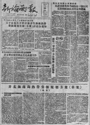 在中央和中共广东省委、广东省人委的领导支持下,曾经组织了海南区一千多人的勘察大军,以五个月的时间,踏查了全岛每个角落后所制订的“开发海南岛热带资源规划方案(草案)”在今天公布了!这是一个有史以来第一次提出的开发祖国宝岛的伟大建设计划,它充分地反映了全岛人民千百年来的崇高愿望,给全岛人民以极大的鼓舞。千百年来祖先们的理想,将可能由我们在今后的二十年,或者更多一些的时间完成这个光荣的任务。