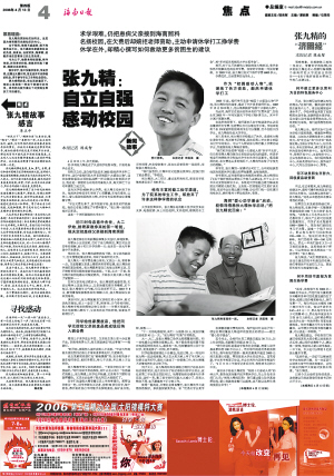 作/品/延/伸 《张九精:自立自强感动校园》见报后,2006年5月9日,中央领导在中宣部新闻阅评上批示:“推荐给中央电视台”。5月15日,中央电视台《新闻联播》播出张九精事迹报道。此后,《光明日报》、《中国教育报》等多家媒体也相继报道了张九精的事迹,本报也进行了连续报道,张九精成为践行社会主义荣辱观的生动典型。