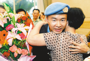“回家的感觉,真好!”在机场出口,身着联合国防暴队服,头戴蓝色贝雷帽的王健走出机场,和早已迎候在此的战友和家人紧紧拥抱。