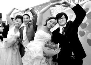 5月8日,在桐乡打工的姐姐方丽霞(右二)与妹妹方丽莉(左一)同天参加集体婚礼。 当日,一场隆重的集体婚典在浙江省桐乡市濮院镇举行,在濮院镇务工的28对新人幸福地步入婚姻殿堂。 新华社发(邵全海 摄)