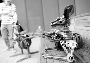 5月8日,一名观众在观看“袋鼠”。在上海世博园澳大利亚馆附近,两件由废旧钢铁器材制作而成的《城市袋鼠》作品,引起许多观众的兴趣。 新华社记者徐家军摄