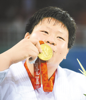 佟文夺得北京奥运会女子柔道78公斤以上级冠军后在领奖台上亲吻金牌。
