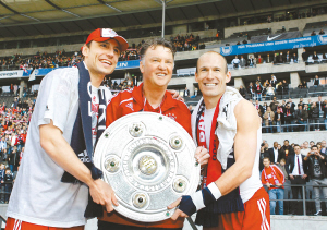 5月9日,在德国足球甲级联赛最后一轮比赛中,拜仁慕尼黑队客场以3:1战胜柏林赫塔队,成为本赛季德甲冠军。这也是拜仁历史上第22次夺得德甲联赛冠军。 图为拜仁主帅范加尔(中)与队长范博梅尔(左)、队员罗本庆祝胜利。 新华社发