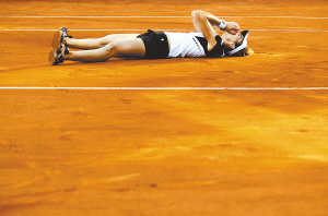 5月9日,在WTA罗马赛单打决赛中,桑切斯以2:0战胜塞尔维亚选手扬科维奇,获得冠军。图为西班牙选手桑切斯在比赛后倒地庆祝胜利。 新华社发