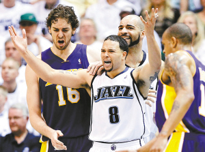 5月9日,在NBA季后赛中,湖人队客场以111:110胜爵士队,从而以3:0的总比分继续领先。图为爵士队威廉姆斯(中)对裁判判罚表示不满。 新华社发