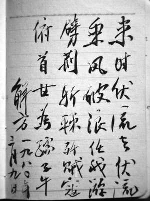 “来时伏流去伏流,乘风破浪任我游。劈荆斩棘歼贼寇,俯首甘为孺子牛。”黄进先老人拿出一个小小的采访本,翻开发黄的纸页,是用苍劲的毛笔字体题写的这一首诗,诗尾落款:解方1980年3月9日。