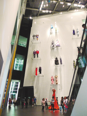 进入大厅,映入观众眼帘的是两堵高达20多米的大幅造型墙。一面是范思哲的时装墙,十组不同款式的绚丽时尚礼服被支立在透明玻璃板上,在近门的一面墙上悬靠着。墙的前方,一席大红色晚礼服夺人眼球,目测有3米多高,估计是提前给姚明的女儿设计准备的吧。