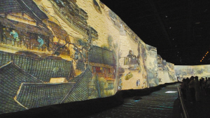 “智慧的长河”展厅让我不得不驻足,传说中的《清明上河图》就在这个展厅。原先我在电视里看了一些《清明上河图》的介绍,感觉很不错,来了以后才觉得现场的效果更加震撼。按原作画卷尺寸放大了30倍的多媒体墙长达128米,呈现了1000多个栩栩如生的动态人物,他们在画中或走或立,或动或静。人物角色丰富异常,吆喝的、叫卖的、背篓的、挑担的、赶集的、打伞的、坐车的、喝茶的、做饭的、砍木的、拉纤的、把舵的、摇橹的、挑灯的,等等。宋代张择端版《清明上河图》反映的是北宋时期东京汴梁的白天城市生活,而在多媒体墙上,《清明上河图》除了展示白天的汴梁城外,更描述了夜晚万家灯火的居民生活,繁华而热闹。我站在展厅中央,凝望画卷,此刻,我看的不是画,更不是寂寞,而是中华民族几千年的文化和历史。