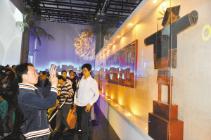 | 游客对海南馆的黎族树皮衣产生了浓厚兴趣。本报特派记者 王凯 摄 |