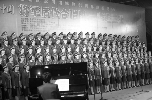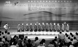 落笔洞畔红歌嘹亮,天涯海角激情飞扬。5月9日晚,“唱响中国”将军后代合唱团放歌海南大学三亚学院,百余名将军后代深情演唱《东方红》、《我爱五指山、我爱万泉河》等共和国红歌,与上千名市民和驻地官兵共同庆祝海南解放60周年。 本报记者 苏建强 郭景水 摄影报道