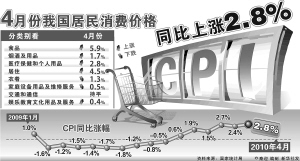 据新华网5月11日电 作为二季度开局的4月份数据已于今日揭晓,CPI同比上涨2.8%,创下2008年11月以来18个月新高;新增人民币贷款达7740亿元,较3月份的5000多亿元增长有所回升;70个大中城市房屋销售价格同比上涨12.8%,涨幅再创新高。