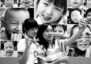 上图为5月11日,两位女青年在六十张充满朝气的笑脸前用手机合影。