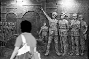 正在省博物馆展出的海南解放60周年图片展和雕塑展,连日来吸引了众多市民前往参观。 左图为观众在栩栩如生的雕塑前驻足参观。 本报记者 苏晓杰 摄