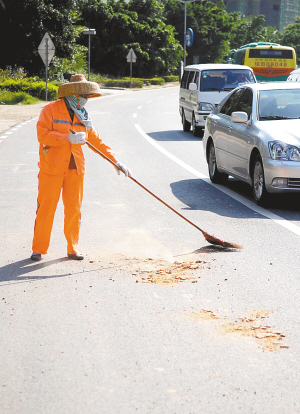 五月十一日上午,一辆渣土车途经榆亚大道时撒下不少泥土。一名女环卫工人顶着烈日在车流中进行清扫。 本报记者 苏建强 摄