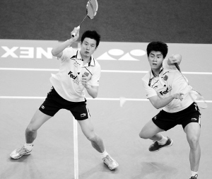 | 中国队男双选手蔡赟/付海峰(右)在比赛中。 新华社发 |