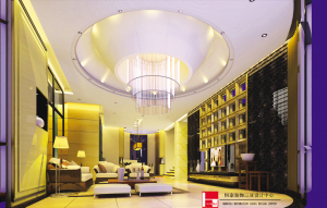 造形新异的圆形天花设计,层层相叠的圆形水晶光纤吊灯,这组设计源于火箭推进器喷射嘴,寓意着发展,上升,前进……配以大幅的天然石材与金泊质地的“九宫格”田字造形(九为阳,双层九宫格寓意九九归一,映射和谐,团圆,田字造形则寓意着丰收。)TV背景墙面所营造出的不单是奢华,更多的是庄重和温厚之感。星点式的灯光布置,漫反射的光感设计为屋主营造出适合的与家人闲聊,沟通亲情之处。