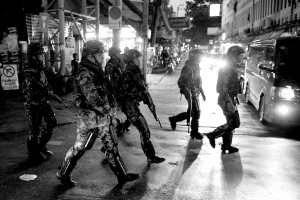 | ↑ 5月13日,泰国士兵在首都曼谷“红衫军”集会地附近巡逻。