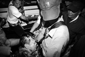 | ← 受伤的卡迪亚·萨瓦滴蓬被抬往救护车。 新华社/法新 |