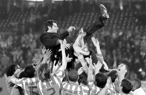 5月13日,在德国汉堡进行的足球欧罗巴联赛决赛中,马德里竞技队以2比1战胜富勒姆队,获得欧罗巴联赛冠军。图为马竞队球员在获胜后将教练弗洛雷斯抛起庆祝。 新华社发