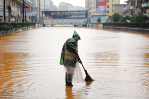 | 5月13日,新余市的街道被水浸泡。5月12日至13日,江西32个县市出现暴雨、大暴雨天气,多个县市发生严重内涝。 新华社发 |