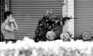 一些躲在沙袋后面和大楼屋顶的政府军士兵时而向“红衫军”射击,“红衫军”则以自制汽油弹回击。泰国军方发言人讪森·胶坤内说,“红衫军”示威者中包含大约500名武装人员。