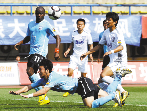 5月15日,在中超第8轮比赛中,大连实德队主场1:2负于天津队。图为实德队球员王选宏(下)在进攻时摔倒。 新华社发