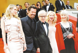 | 伍迪·艾伦(中)与演员露西·庞奇(左一)、乔什·布洛林(左二)、娜奥米·沃茨(右二)、盖玛·琼斯亮相第63届戛纳电影节。 新华社发 |