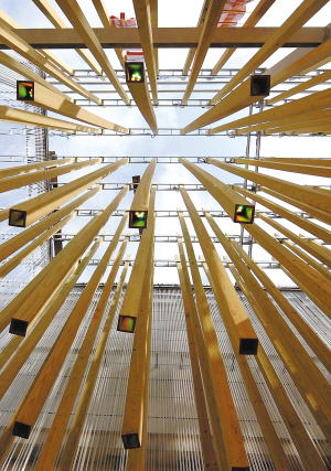 | 右图:匈牙利馆外墙用数百根“从天而降”的木套营造出一个“森林”。 新华社发 |