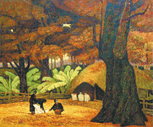 色彩单纯强烈,画面充满神秘感,王锐从不否认,他的创作学习了法国著名印象派大师高更的风格。高更的巅峰之作来自他对南太平洋上塔西提岛原住民的描绘,当地原始古朴的生活从此闻名世界,很多生活方式保持至今,并帮助塔西提岛成为世界著名旅游胜地。