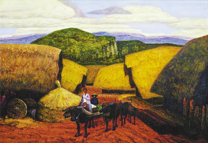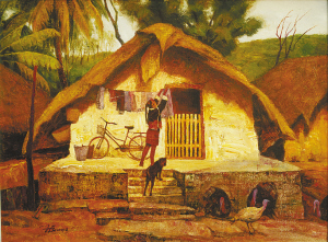 王锐的获奖作品,几乎每一幅画面里都有船型屋的身影。在第三届中国油画展上展出的作品《归》,几幢金黄屋顶的大大的船型屋,将近处归牧的队伍和远山和谐地统一在了同一个画面里,展现出黎村悠然闲适的传统生活。