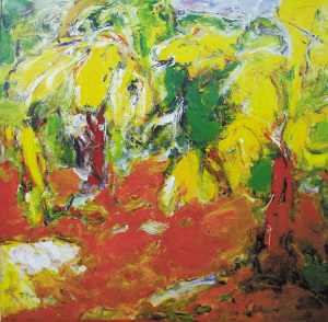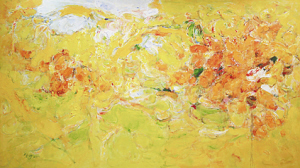 他最近给广州大剧院创作的《荔枝熟了》是一件宽3.5米、高2米的作品,它是果实在阳光下的舞蹈,它是叶子在风中金色的嗓子,它是阳光变幻的戏剧,它是生活迷人的情书,它是生命忘我的奔腾,它是层出无穷的状态,它是多种想象的可能。画作结构严谨,笔触流动,色彩飞跃,洋溢出灿烂又自信的辞采。厚的色块具有立体感,薄的色调如水流过的痕迹,任性又自然。他用了最拿手的黄色来画荔枝叶上闪烁的阳光,用摇曳生姿的红色画果实,杂陈其间的绿色和白色像呼吸一样精细,也是喜悦,细听又感到果实在叶子和阳光之间埋伏着交响乐的曲调。一幅画画得像什么是低层次的,如果这幅作品逼真地画出荔枝来,它就丧失美学欣赏和陌生感融会在一起的精神唤醒。正是何坚宁选择了虚灵透脱,作品才让人浮想联翩,眼睛才饥渴起来,耳朵才竖起来,味蕾才在舌尖上舞蹈起来,才拥有了谜一样的想象。