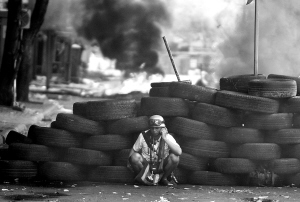 | 5月16日,在泰国首都曼谷街头,一名“红衫军”成员在冲突中躲在路障后面。 新华社/法新 |