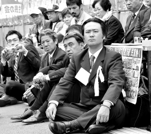 | 冲绳民众代表静坐要求将驻日美军普天间基地迁出冲绳。 新华社/法新 |