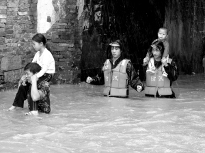 | →救援人员在湖南省江永县上甘棠村转移被洪水围困的儿童。