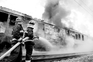 5月17日7点50分左右,一列维修工程列车在行驶至武襄铁路随州经济开发区方台村铁路路段时,第三节车厢突发火情。事故未造成人员伤亡,火灾原因及财产损失目前正在进一步调查之中。 新华社发(杨文明 摄)