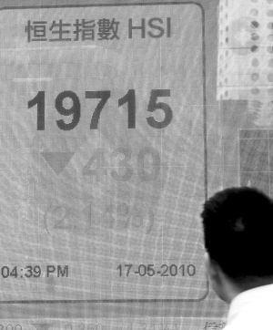 5月17日,市民从香港中环一家银行的恒生指数电子显示屏前走过。当日,香港恒生指数收盘下跌430点,收报19715点,跌幅2.14%。 新华社记者黄本强摄