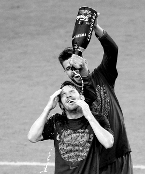 | 巴萨夺冠后,梅西(前)和队友享受“香槟浴”。 新华社发 |