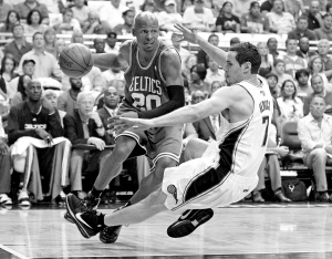 | 北京时间5月17日,NBA东部决赛首开战。图为波士顿凯尔特人队球员雷·阿伦(左)在比赛中进攻。