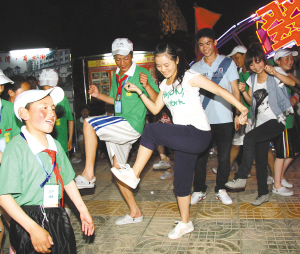 | 5月17日晚,五指山市翡翠花园的翠湖广场,举行欢迎玉树小朋友的篝火晚会。图为五指山黎族学生在教来自玉树的桑巴(左二)跳黎族舞蹈。