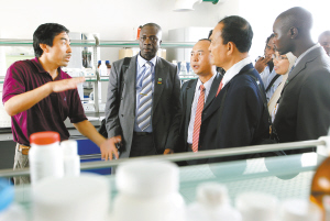 | 来自11国的26名外国学员在中国热带农业科学院生物技术实验室参观交流。 本报记者 苏晓杰 摄 |