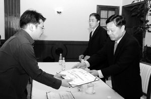 5月19日,中国驻芬兰大使黄兴(右)代表中国教育部向荣获2009年国家优秀自费留学生奖学金的的博士生李剑颁发奖励证书和奖学金。当日,中国驻芬兰大使馆举行了2009年“国家优秀自费留学生奖学金”颁奖仪式,7名在芬兰就读的中国博士生获此殊荣。中国驻芬兰大使黄兴代表中国教育部向分别就读于芬兰赫尔辛基大学、赫尔辛基工业大学、图尔库大学和坦佩雷工业大学的汤靖、李剑、戴晓峰、林然然、张赐勋、曹广宇和郑洁七位获得“国家优秀自费留学生奖学金”的博士生颁发了奖励证书和奖学金。 新华社记者 赵长春 摄