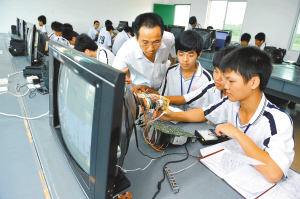 作为一所以培养应用人才为主的省级重点职业学校,琼海市职业中等专业学校正逐步成为我省东部市县技能型人才的培训基地。 该校目前有教职工160多人,在校生3000多名,开设专业10多个。近年来,学校的毕业生供不应求,就业率均保持在98%以上。图为5月20日,琼海市职业中等专业学校的学生们正在学习电子设备维修技能。 本报记者 王凯 特约记者 王仪 摄