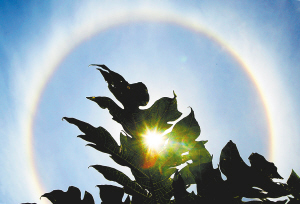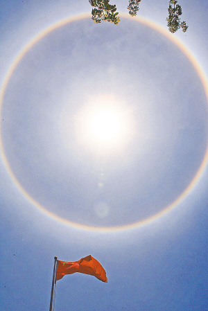 5月20日上午9时许,海口上空出现罕见的日晕现象———太阳周围被戴上了一个彩色的大光圈。下午13时许,日晕现象逐渐消失,整个过程持续近4个小时。专家介绍,日晕虽是正常天气现象,但像今天这样清晰、持续时间4小时的日晕,此前还比较少见。 据相关资料,日晕是一种大气光学现象,是日光通过云层中的冰晶时,经折射而形成的光现象,围绕太阳环形,呈彩色。在气象上称之为“光晕现象”,也叫“光环效应”,而晴天出现的光晕又称日晕。 图为海口上空出现的日晕。 本报记者 李英挺 摄影报道