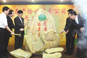 5月20日,嘉宾在国泰产险福建分公司开业典礼上以“开山劈石”的方式揭牌。 国泰产险福建分公司于当天正式揭牌开业,这是福建保险市场上第一家开业的台资财产保险公司。国泰产险是由台湾国泰金融集团旗下的国泰人寿和国泰世纪产险合资创建,其总部位于上海,此前已在江苏设立分公司,福建是第二个设立分公司的省份。 新华社发