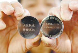 5月20日拍摄的标称值为100克的“便民砝码”。当日是世界计量日,安徽省质监局在合肥向市民集中免费发放上千个“便民砝码”。市民购物时可用“便民砝码”当场识别“黑心秤”,防止商家短斤少两。 新华社发
