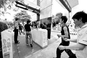 | 五月二十一日,富士康员工从深圳富士康科技集团南门刷卡进入厂区。 新华社发 |
