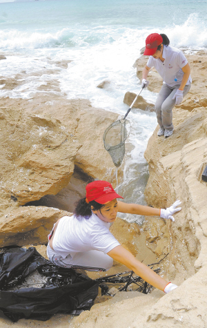 日前,三亚万豪、丽思卡尔顿、希尔顿、喜来登等酒店的200多名中外员工冒着烈日清理了亚龙湾西段数公里的海滩垃圾。 本报记者 苏建强 摄