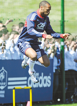 | 24日,法国队在主帅多梅内克的带领下来到阿尔卑斯山下的训练营中,继续采取各种训练方式备战世界杯。图为法国队前锋亨利在训练中。 小新发