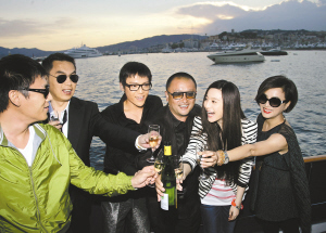 | 《日照重庆》主创人员22日在戛纳举杯庆祝导演王小帅(右三)生日快乐 |